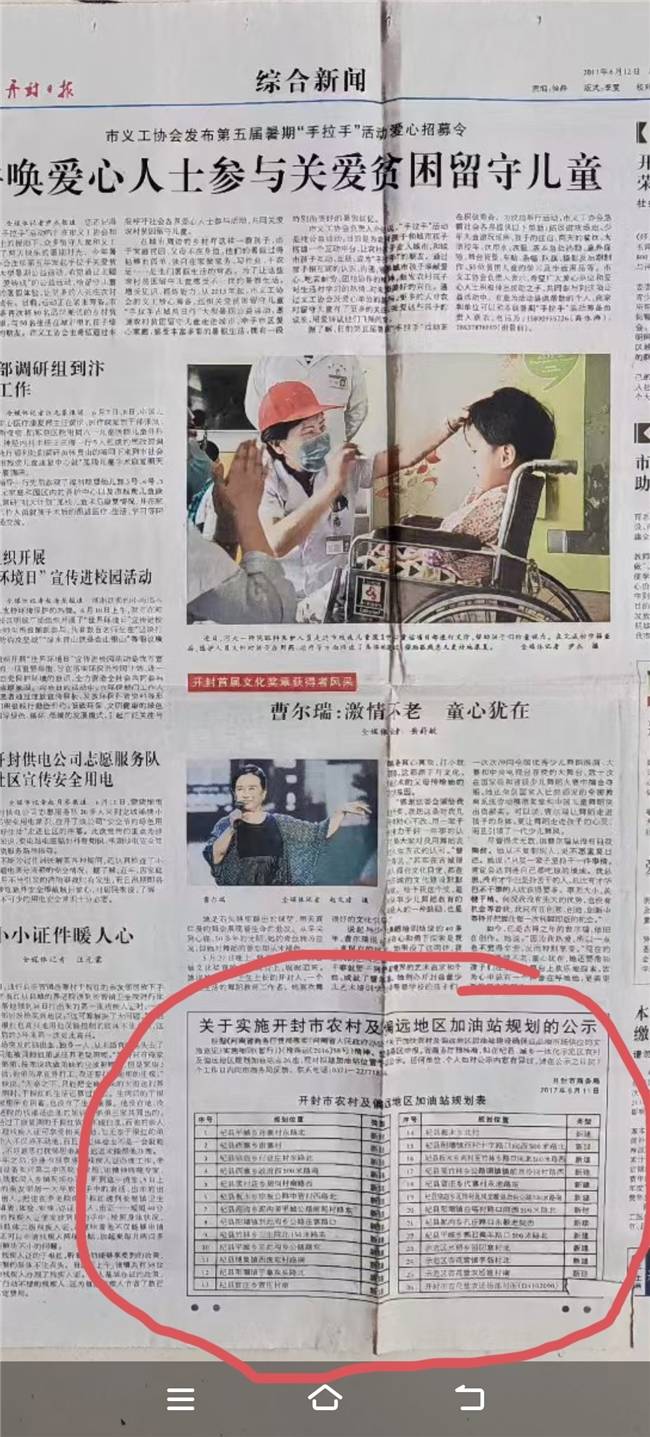 据知情人提供的材料显示,《开封日报》2017年6月12日刊登了《开封市商务局《关于实施开封农村及偏远地区加油站规划的公示》公告,其中,公告的杞县自力燃料公司的经营地址为前泥村,然而,地图显示该公司实际经营地址却在杨庄村区域,两地点距离相差三四公里,公示地址与实际建站地址严重不符。