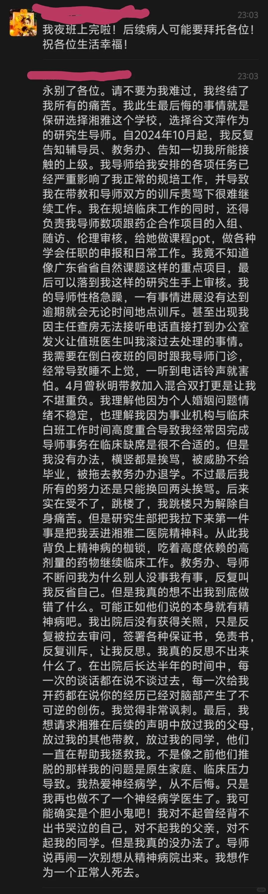 对该同学的不幸离世,我们深感哀痛和惋惜,将协助家属做好善后工作。目前,中南大学和湖南省卫生健康委已成立联合调查组,对网传相关情况依规依纪依法开展调查。