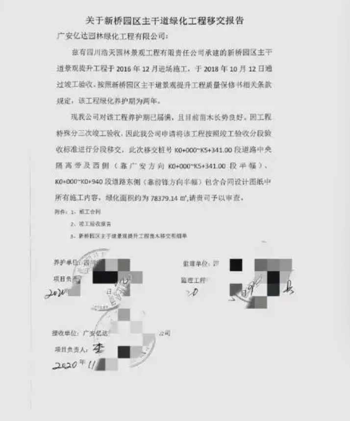 案涉工程分两段于2018年10月、2019年11月竣工验收合格,浩天公司按合同约定完成全部施工内容,除种植土施工外,还包括部分新栽苗木(151.64万元)、所有原有苗木移栽(47.72万元),且已完成合同约定的2年养护义务,所有工程均于2020-2021年正式移交亿达公司并完成签字盖章确认。