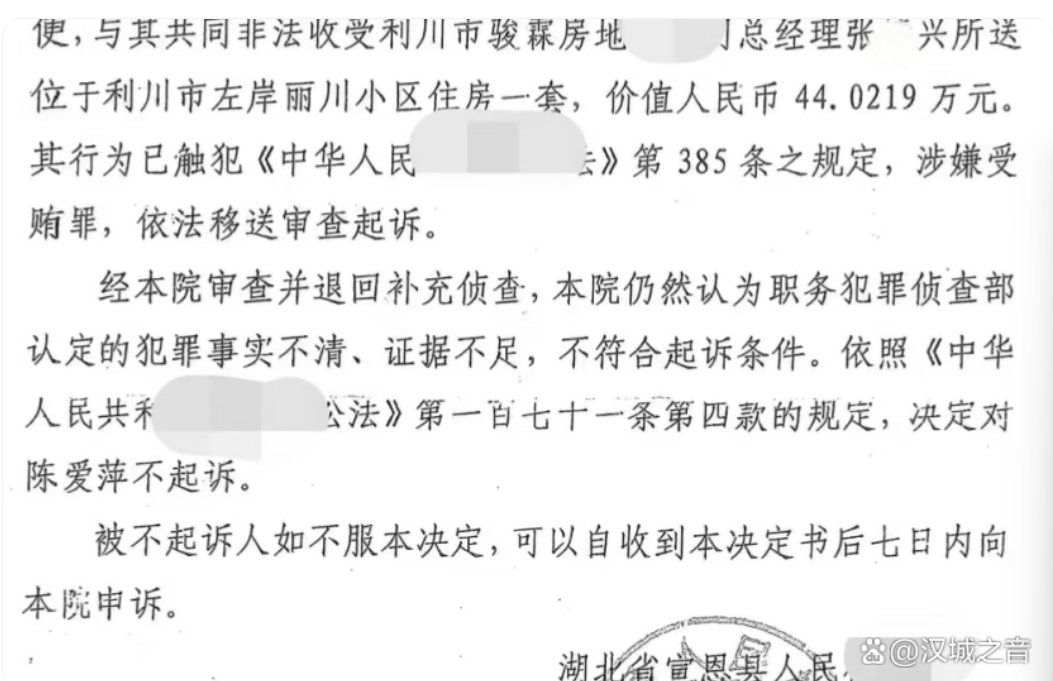 2017 年 12 月,宣恩县检察院经 38 个月侦查,对陈某萍作出不起诉决定;2020 年 2 月,恩施州检察院向陈某萍作出刑事赔偿决定。两份文书均认定,陈某萍与郑凯共谋受贿的事实不清、证据不足,彻底推翻原审关于房产受贿的认定。